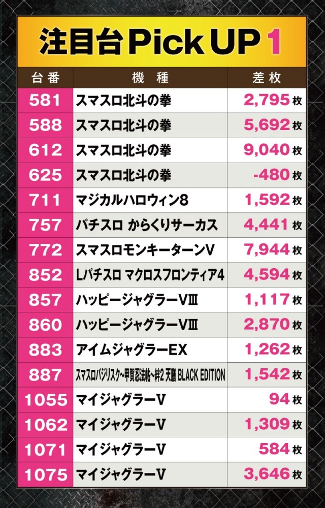 今回は店内の様々なところからの好調台が目に付く結果となった。次回降臨時は、ぜひあなたがチャンスを掴んでくれ!