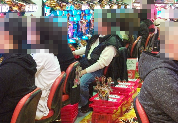 昼以降の様子をみてみると、20円パチスロでは「バジリスク〜甲賀忍法帖〜絆」と「沖ドキ!」、ミリオンゴッドシリーズが大盛況。