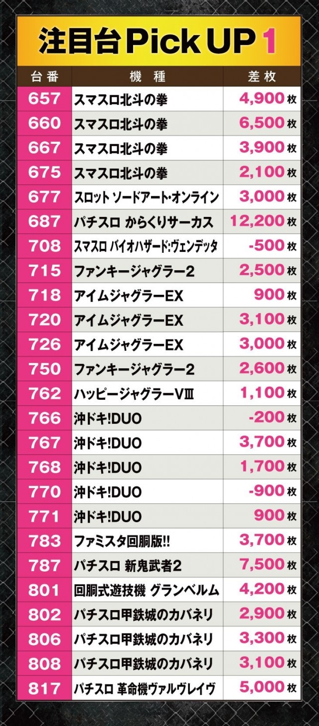 『スマスロ北斗の拳』や『アイムジャグラーEX』、『パチスロ甲鉄城のカバネリ』などメイン機種を中心に好調台が多く、全台がプラスなだけでなく機種性能を最大限に引き出す台が続出していた。