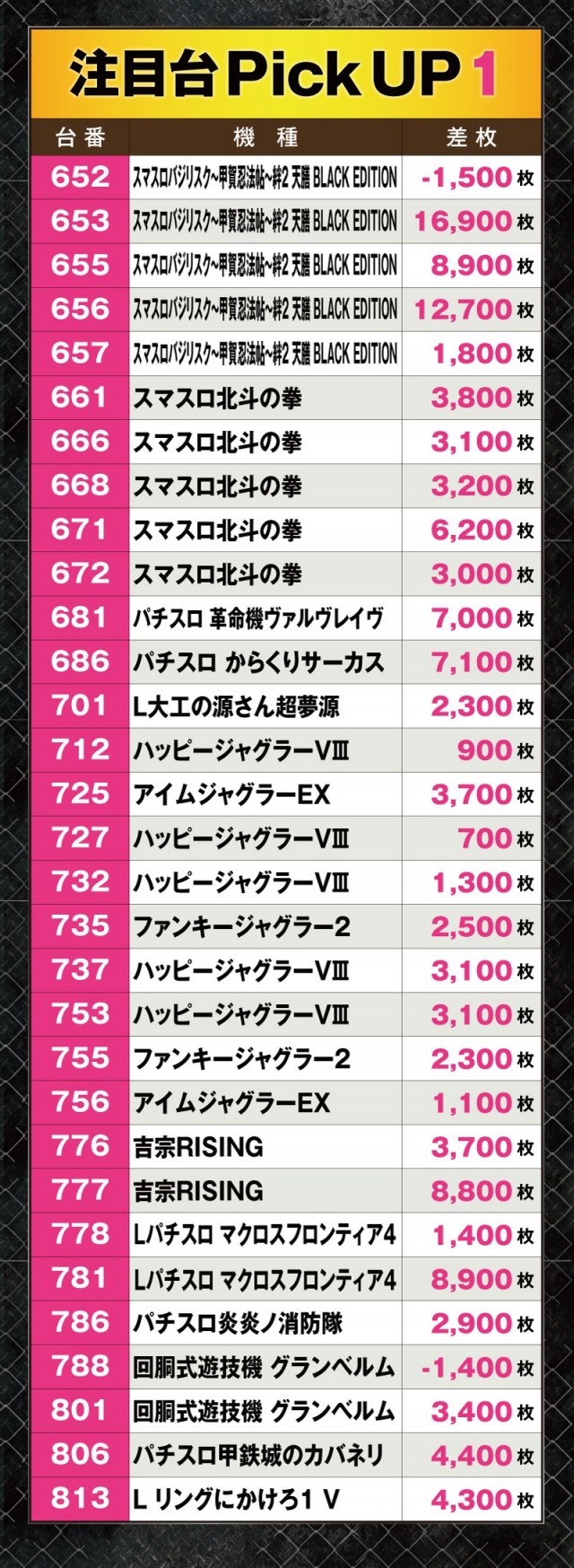 今回の店内状況はというと、3,000枚を超える好調台が続出する内容となっていた!なかでも『スマスロバジリスク~甲賀忍法帖~絆2 天膳 BLACK EDITION』は、2台が万枚オーバーという見事な結果も確認している。