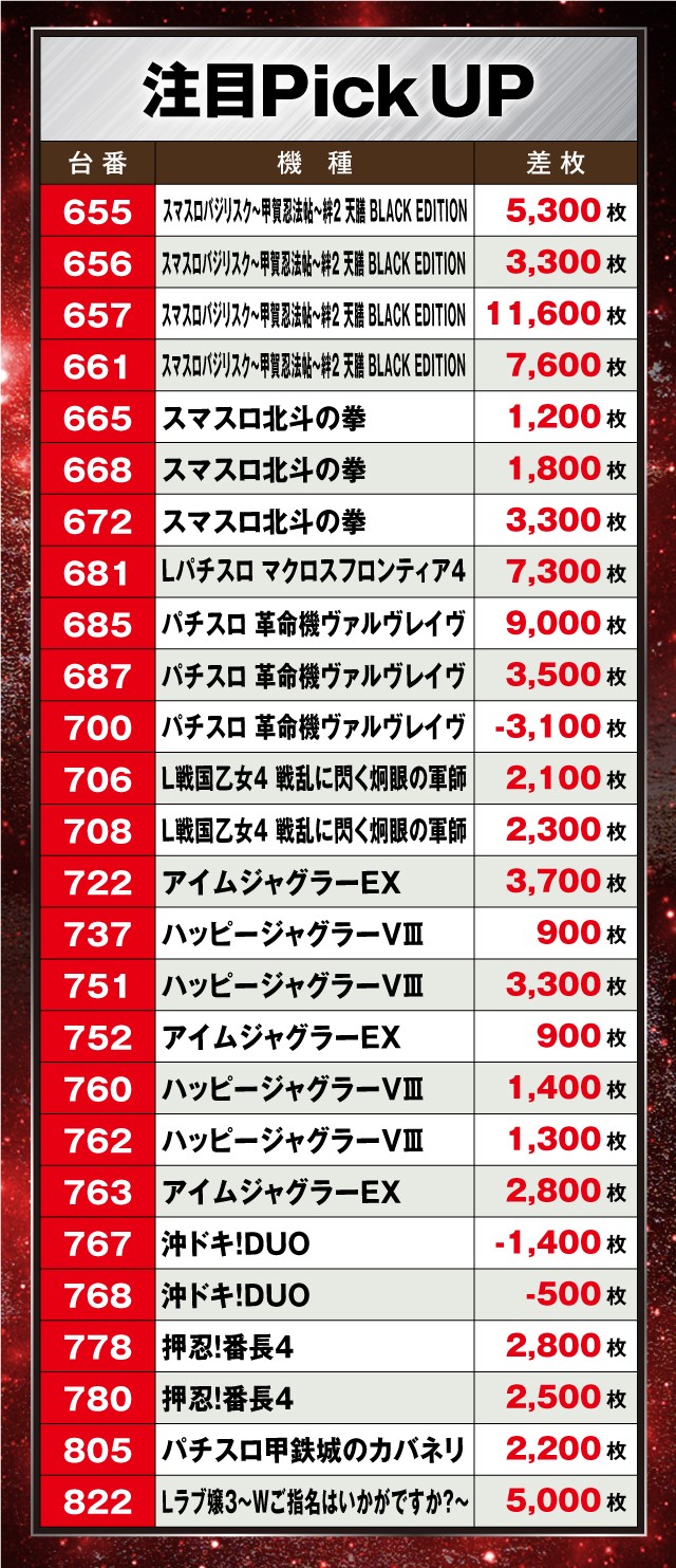 なかでも『スマスロバジリスク~甲賀忍法帖~絆2 天膳 BLACK EDITION』が3台並びで注目を集めており、平均+6,733枚と機種のポテンシャルを最大限に発揮していた!