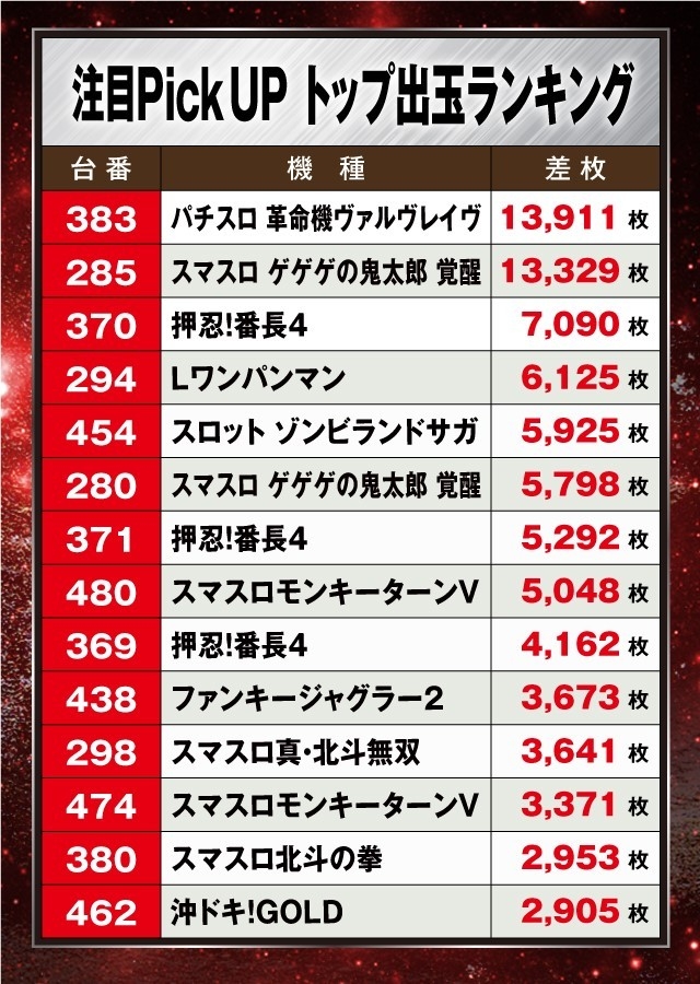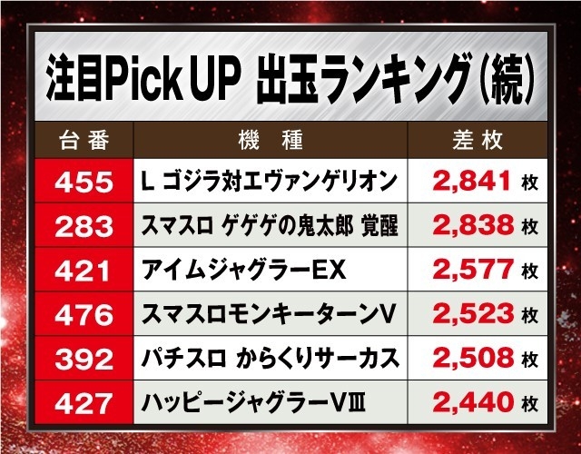 この日、出玉ランキング1位に輝いたのは『パチスロ 革命機ヴァルヴレイヴ』で+13,911枚という圧巻の結果を残している。また、2位の『スマスロ ゲゲゲの鬼太郎 覚醒』からも万枚超が出現しているが、それ以外に+5,000枚超や+2,000枚超も発生しており、そのポテンシャルの高さを広くアピールしていた。