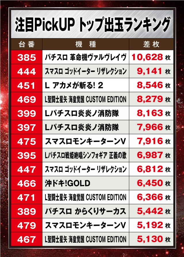 この日の状況をチェックしてみると+5,000枚超が大量出現。なかでも『パチスロ 革命機ヴァルヴレイ』が万枚超を記録、さらに『スマスロ ゴッドイーター リザレクション』は万枚目前と、この2機種が見事な結果を残している。