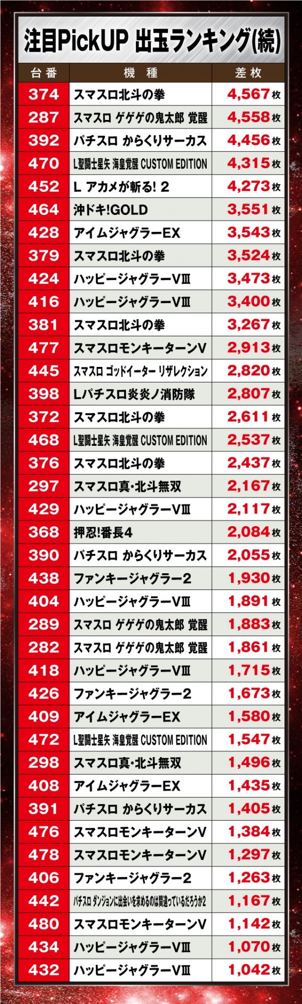 さらに、その他の機種では『L アカメが斬る! 2』、『L聖闘士星矢 海皇覚醒 CUSTOM EDITION』、『Lパチスロ炎炎ノ消防隊』が+8,000枚超を叩き出し、店内はいたるところで熱気に満ち溢れる一日となった。