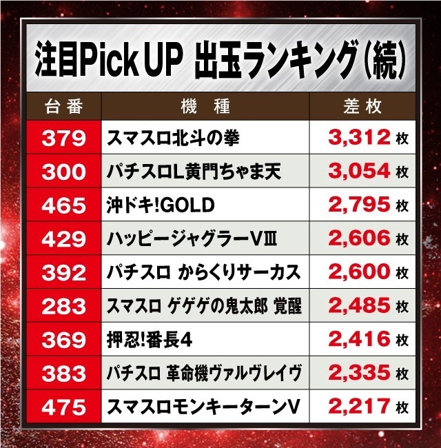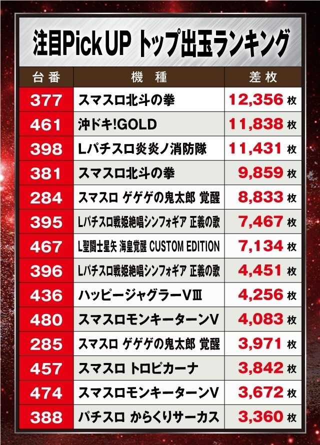 この日、特に活気に満ち溢れていたのが『スマスロ北斗の拳』で、出玉ランキング1位になった377番台が万枚超の+12,356枚、さらに381番台も万枚目前の+9,859枚という見事な結果を残している。