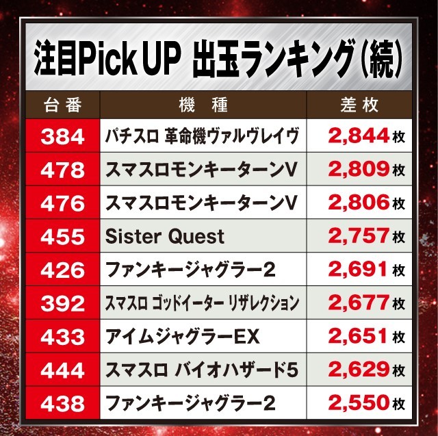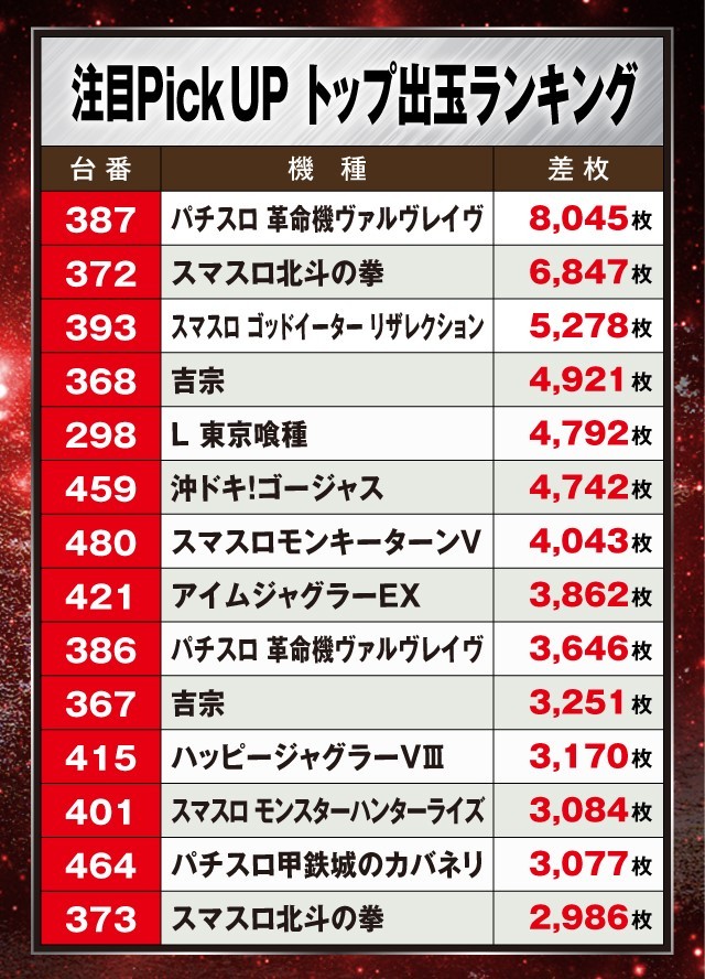 また、新台系も決して負けてはおらず、導入間もない『吉宗』から+4,921枚に+3,251枚といったハイスコアが発生。そのポテンシャルの高さをしっかりと発揮しプレイヤーの注目を集めていた。