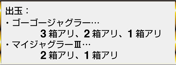 おなじく朝イチから人気を集めていたジャグラーシリーズでは、『ゴーゴージャグラー』や『マイジャグラーⅢ』などで3箱を上回る出玉を目にした。