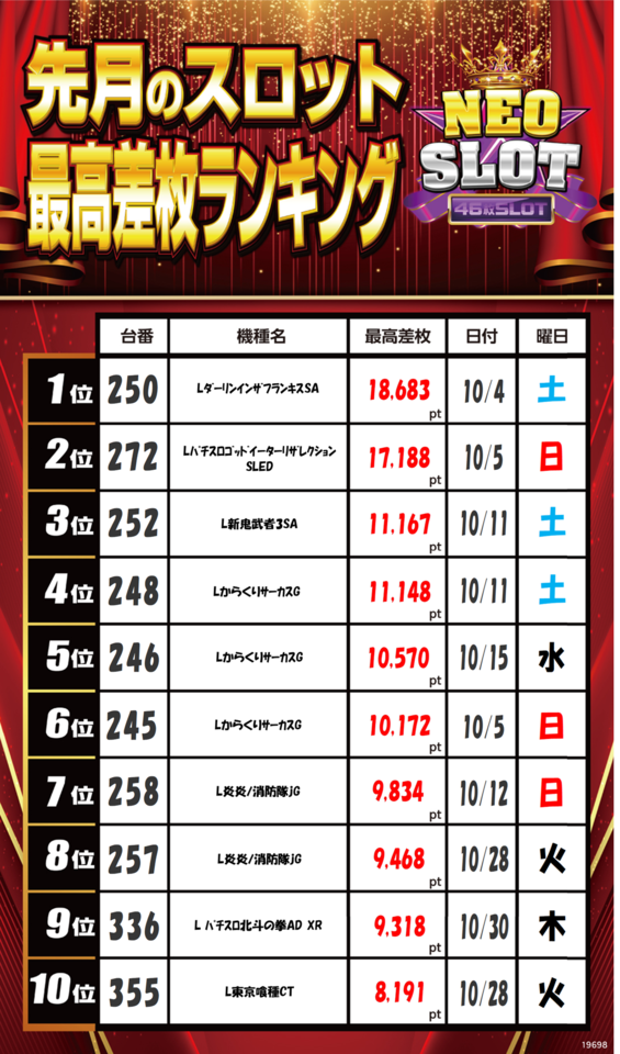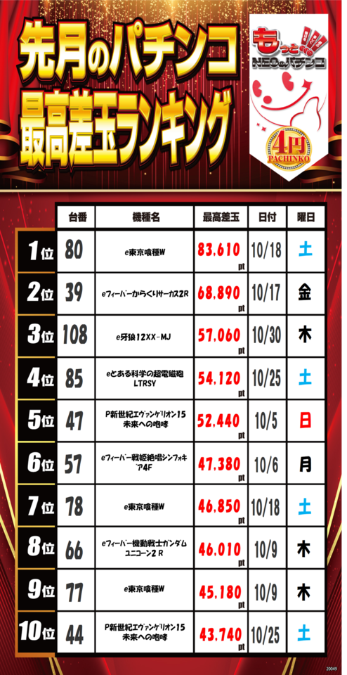 1位 10月20日(月) 2位 11月8日(土) 3位 10月23日(木)