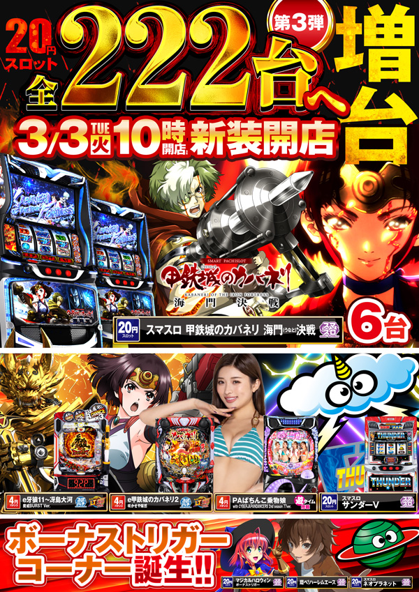 3月3日、新装開店🎯20円スロット増台第3弾、222台へ🎯