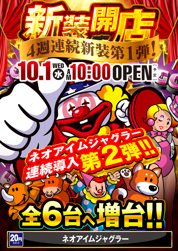 本日新装開店10時オープン‼ネオアイムジャグラー増台続🎯
