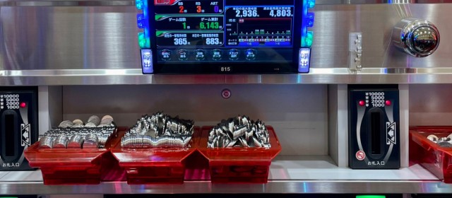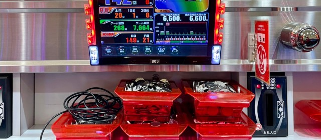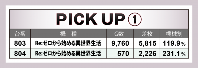 続いてはこの日にプラス台が多かった4機種。横並びでの好調が目立ち、特に『パチスロ バイオハザード7 レジデント イービル』3台設置の全てがプラス&その合計は+1万枚弱となった。その他、2台のうち+5千枚突破台を含んだ『Re:ゼロから始める異世界生活』のドル箱別積みが一際存在感を放っていた。