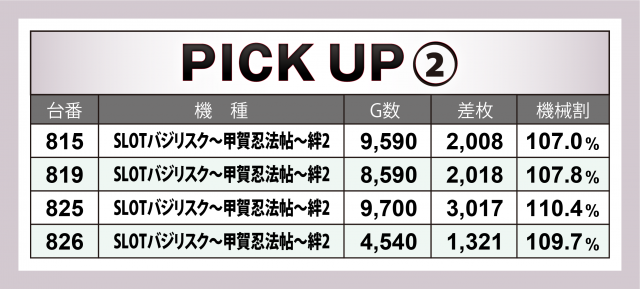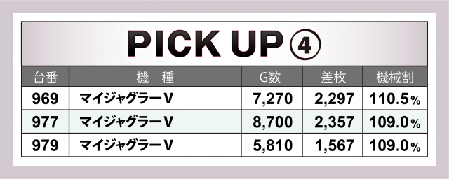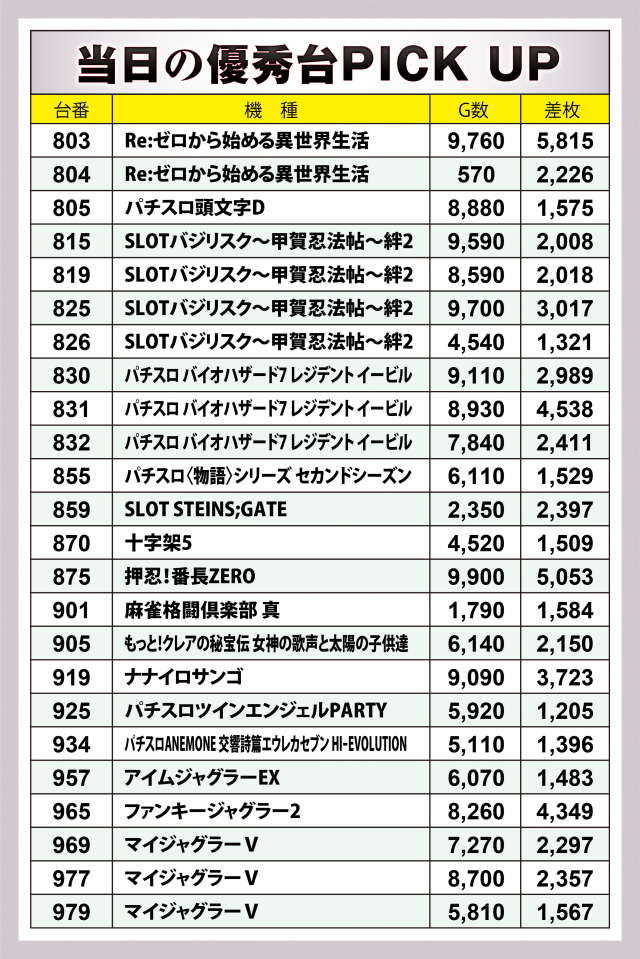 まずは当日上位の優秀24台のPICK UPをチェック。うち15台が差枚数+2千枚以上となり、+4千枚以上となったのが4台だった。後述する好調4機種以外では、1万ゲームにもうすぐ到達する稼働数で+5千枚オーバーとなった『押忍!番長ZERO』やノーマルタイプでは+4千枚突破と大健闘となった『ファンキージャグラー2』の成績が光った。