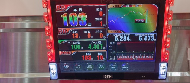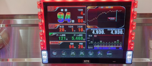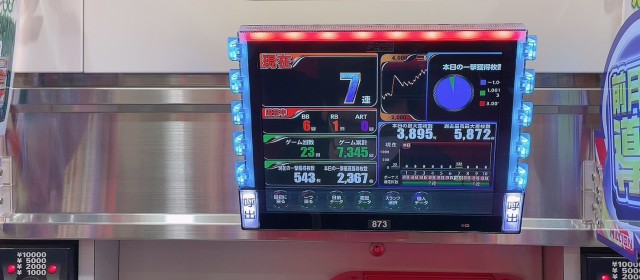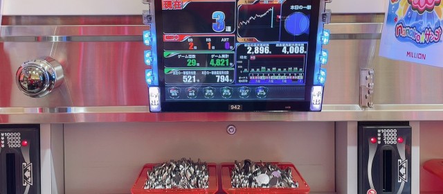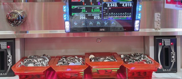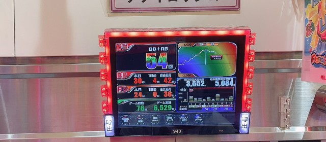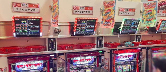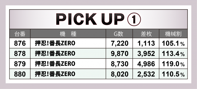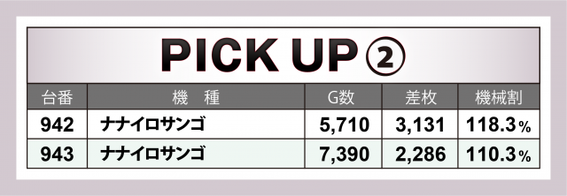 さらにこの日は3機種の出玉が好調。写真やデータでもお分かりの通り、『押忍!番長ZERO』にドル箱別積み台が連発、4台合計で+1万2千枚超をマーク! その他では『ナナイロサンゴ』『マイジャグラーⅤ』といった2機種のボーナスタイプが堅調にメダルを重ねた。