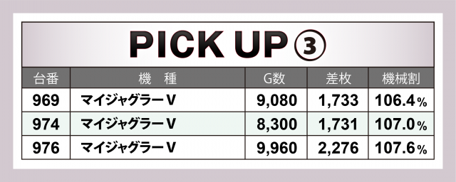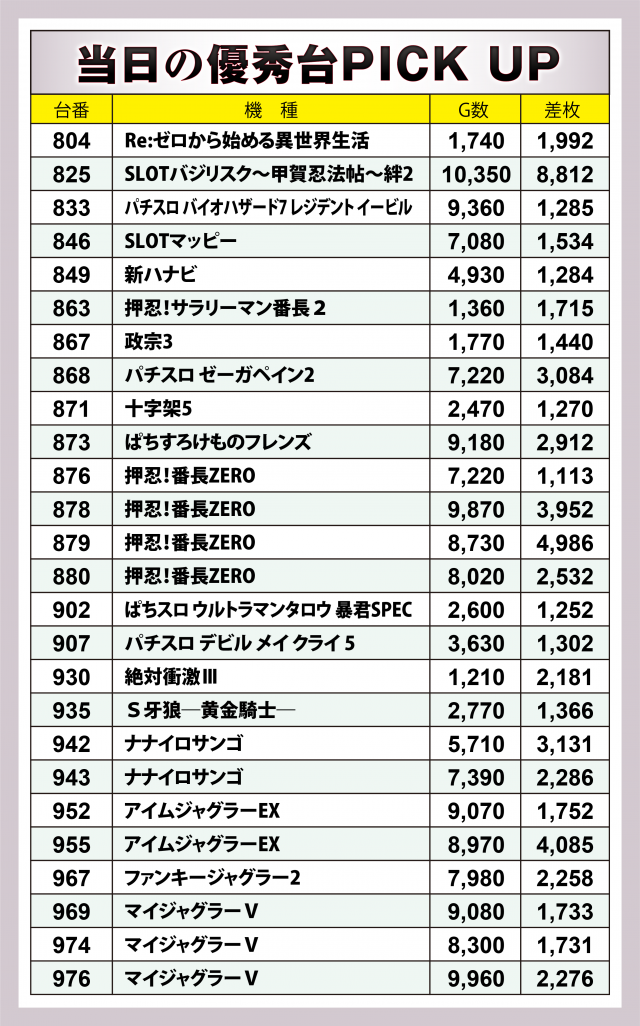 まずは優秀26台PICK UPから。うち5台が差枚数+5千枚以上となり、後述する好調3機種以外の最注目は『SLOTバジリスク~甲賀忍法帖~絆2』。稼働良好で1万ゲーム突破&8千枚オーバーを達成! その他+4千枚超となった『アイムジャグラーEX』や取材日には新台導入間もない&+3千枚を超えた『パチスロ ゼーガペイン2』の好成績が光った。