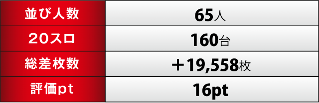 今回の20スロ計160台ではトータル差枚数+19,558枚と、前回に続いて+2万枚クラスのスコアを継続。評価ptも一つ伸ばして16となった。しかし、優秀26台のデータから読み取れる通り、ゲーム数が少ない台がチラホラと目に付いたのが気になった。稼働が伸びていればさらに好成績も望めたかもしれない。次回は連勝すると共に、「英雄」取材に臨む勇者たちには粘り腰の姿勢を貫いてもらいたい。