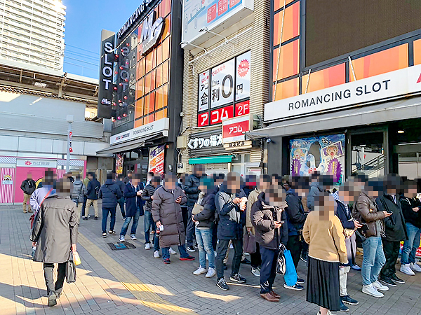 開店前から100人を超えるプレイヤーが足を運んでおり、各人とも遊技開始を待ちきれない様子だった。