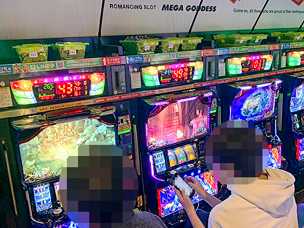 14時半過ぎの20円パチスロをチェックすると「ミリオンゴッド-神々の凱旋-」や「沖ドキ!-30」が好評。プレイヤーの満足そうな表情から、充実した時間を過ごしていたことがうかがえる。