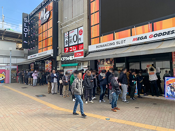 開店前から120人近いプレイヤーが集合。会話を楽しみながら入店を待つ、実に和やかなシーンを目にしている。