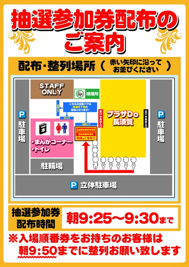 ①抽選参加券配布時間9:25~9:30②抽選開始9:35③再整列9:50④入場開始10:00 |
