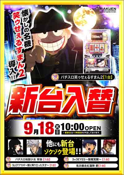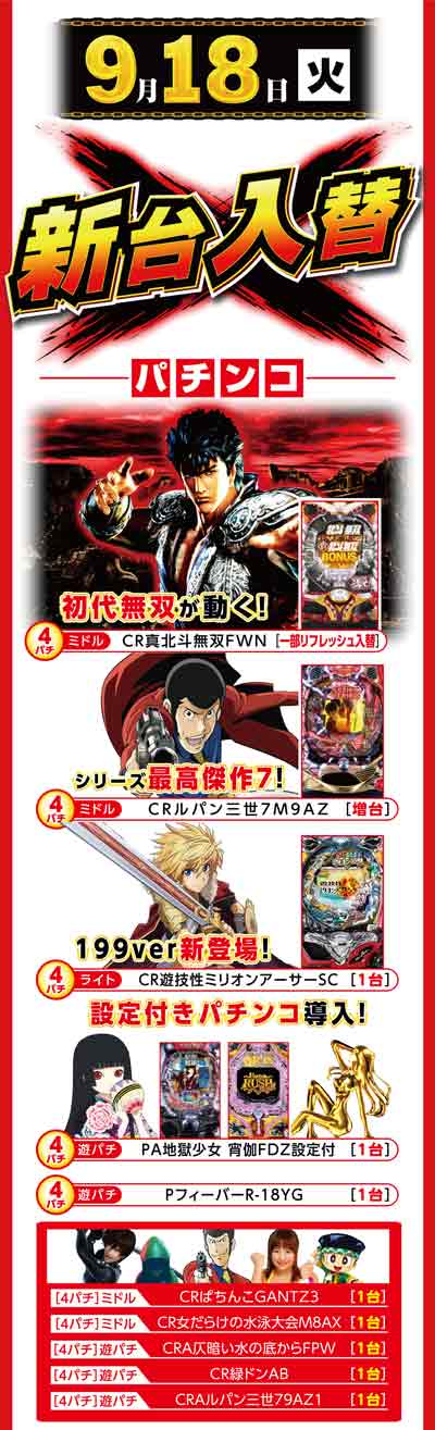明日9月18日(火) 全館10時開店&新台入替!!