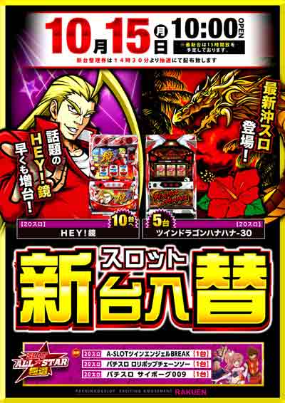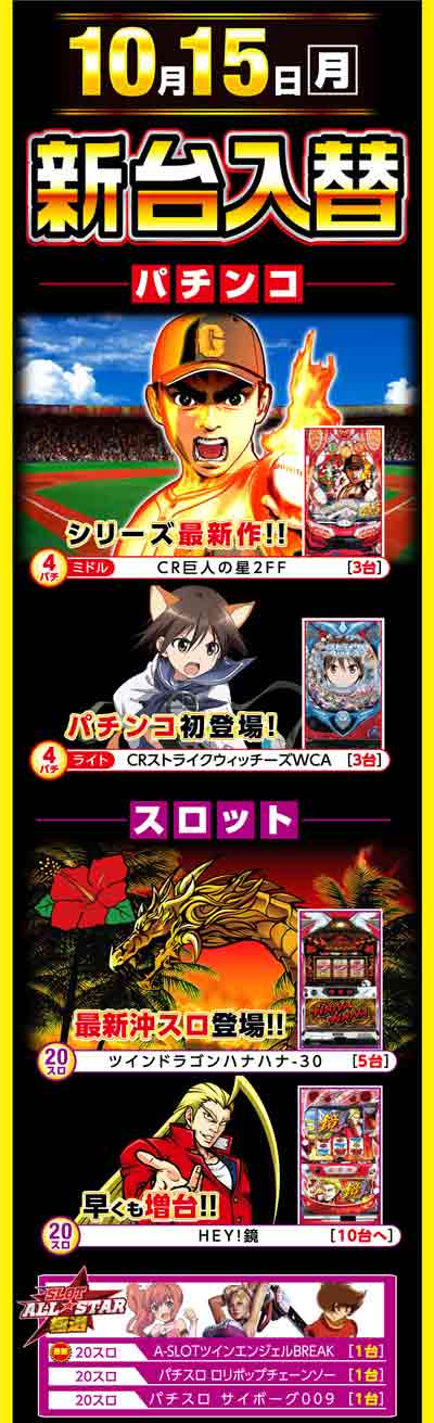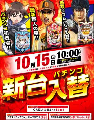 明日10月15日(月) 全館10時開店&新台入替