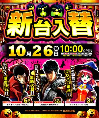 明日10月26日(金) 全館10時開店&新台入替!!