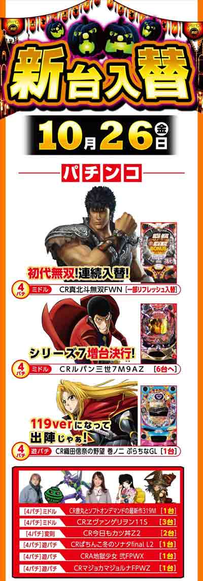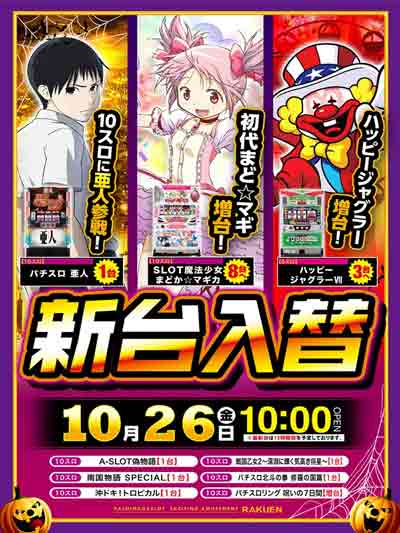 本日10月26日(金) 全館10時開店&新台入替!!