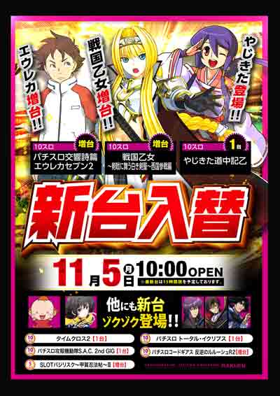 明日11月5日(月) 全館10時開店&新台入替!!
