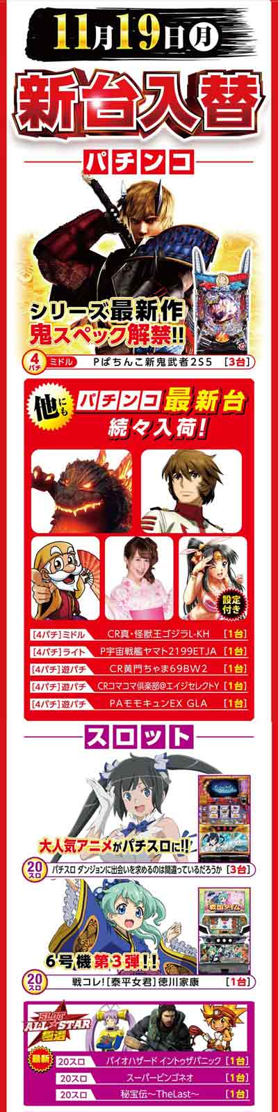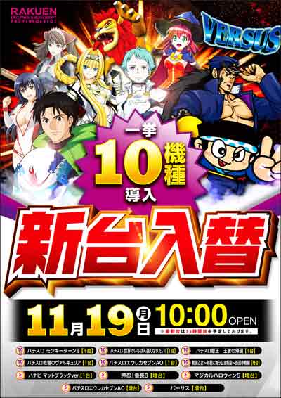 明日11月19日(月) 全館10時開店&新台入替!!