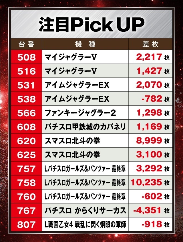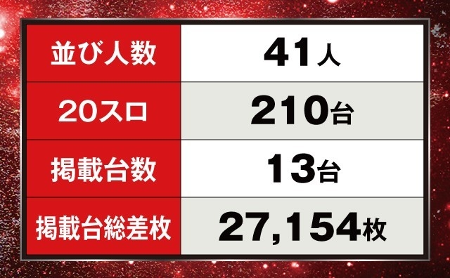 今回対象となった13台のうちプラスで終えたのは9台で全台平均が+2,089枚という結果にプレイヤーたちは大満足の一日だったに違いないだろう。
