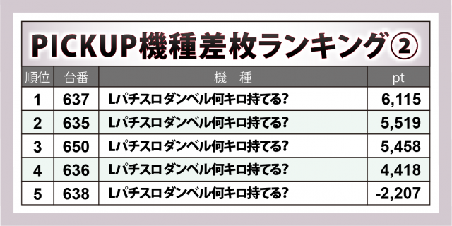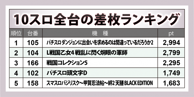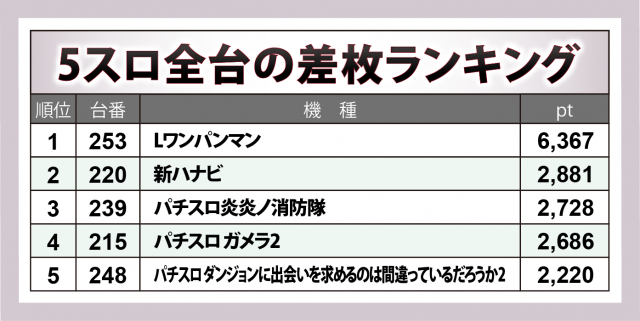 5台がオール4桁プラスとなったが、最大でも+3,000枚弱となり、もうひと伸びがあればなお良かった。