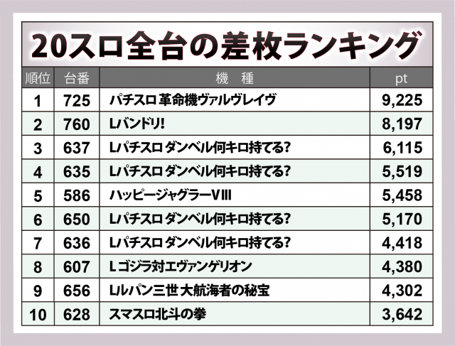 この日の上位10台は全て+3,600枚以上を達成し、+4,000枚以上は9台、+5,000枚オーバーは6台、+6,000枚オーバーは3台、+8,000枚オーバーは2台、+9,000枚オーバーは1台となった。