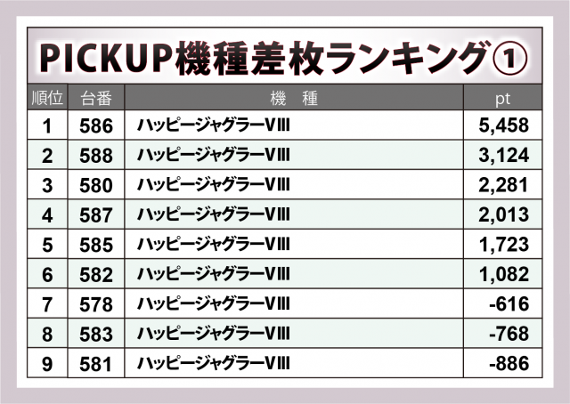 また『ハッピージャグラーVⅢ』は時差開放にもかかわらず、+5,500枚弱を筆頭に+3,100枚超が1台・+2,000枚超&+1,000枚超が2台ずつと、安定の中にも突出した数値が見受けられた。