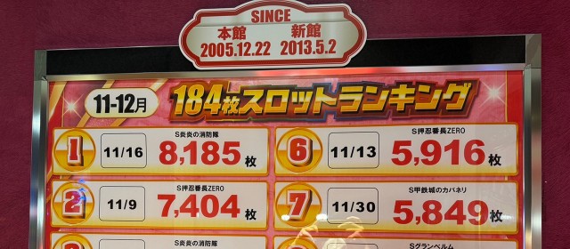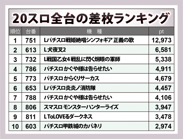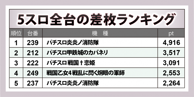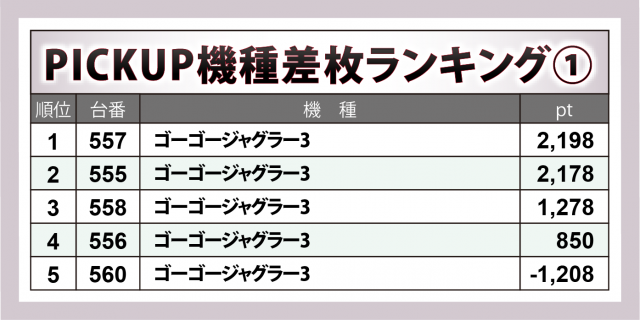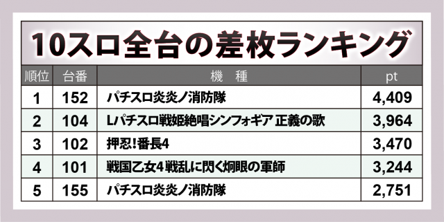 5台がオール+2,700枚以上、+3,000枚以上は4台、+4,000枚以上は1台と、チャンスが秘められていたようだ。また[1000円/46枚]スロと同じ機種がランクインしていたことは興味深い。