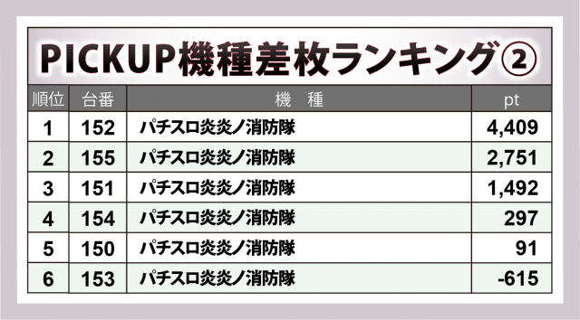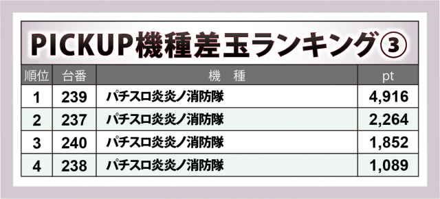 そして当コーナーでも『炎炎』が好況であり、設置4台全てが4桁プラス。239番台が+4,900枚超となったのを皮切りに、その後も+2,300枚弱・+1,900枚弱・+1,100枚弱と並んだ。