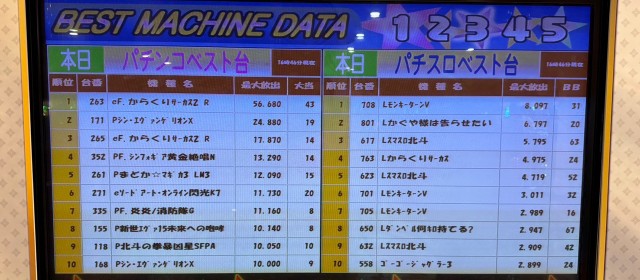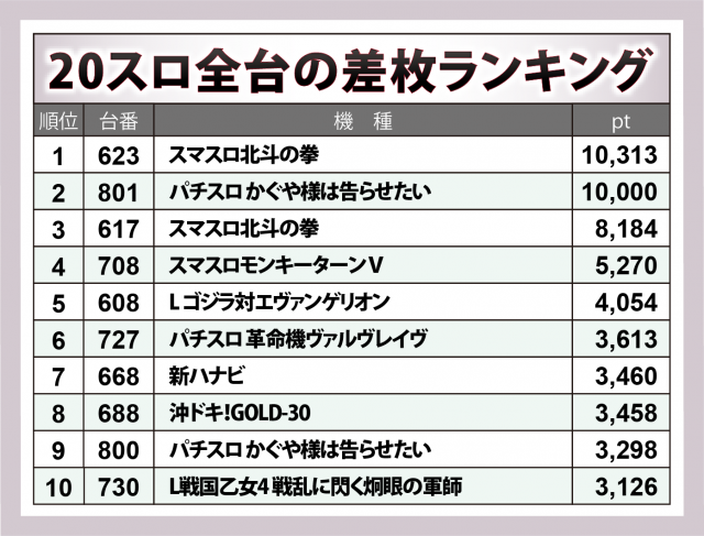 差枚数順に挙げていくと、『スマスロ北斗の拳』では+10,300枚超・+8,200枚弱が1台ずつ、『パチスロ かぐや様は告らせたい』では+10,000枚超・+3,300枚弱が1台ずつ、『スマスロモンキーターンⅤ』の+5,300枚弱、『L ゴジラ対エヴァンゲリオン』の+4,100枚弱とスマスロがビッグヒットを残す一方、メダル機の『新ハナビ』『沖ドキ!GOLD-30』も健闘を果たした。