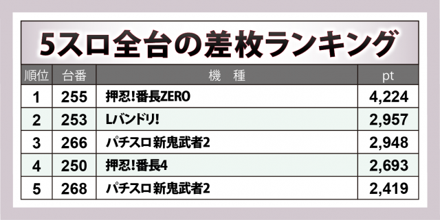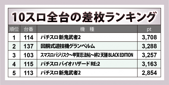5台がオール+2,800枚以上、+3,000枚以上は4台と、過去4回に引けを取らない水準となった。
