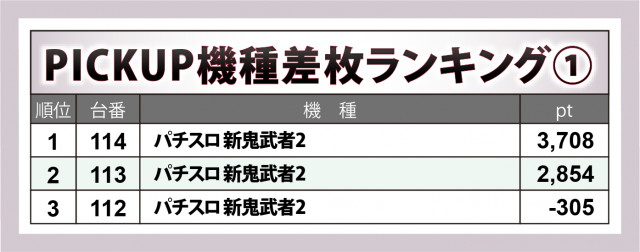 10台の全てが+3,100枚超、+4,000枚以上は5台、+5,000枚オーバーは4台、+8,000枚オーバーは3台、そして万枚をクリアしたのは2台と、リサーチ5回の中で最も多い5桁プラスの台数となった。