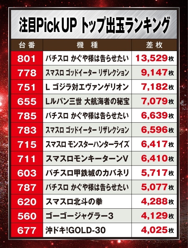 また、その他の機種では『スマスロ ゴッドイーター リザレクション』が+9,147枚、『L ゴジラ対エヴァンゲリオン』と『Lルパン三世 大航海者の秘宝』が+7,000枚超を記録しており、人気のスマスロを中心に多数の好調台が確認されている。