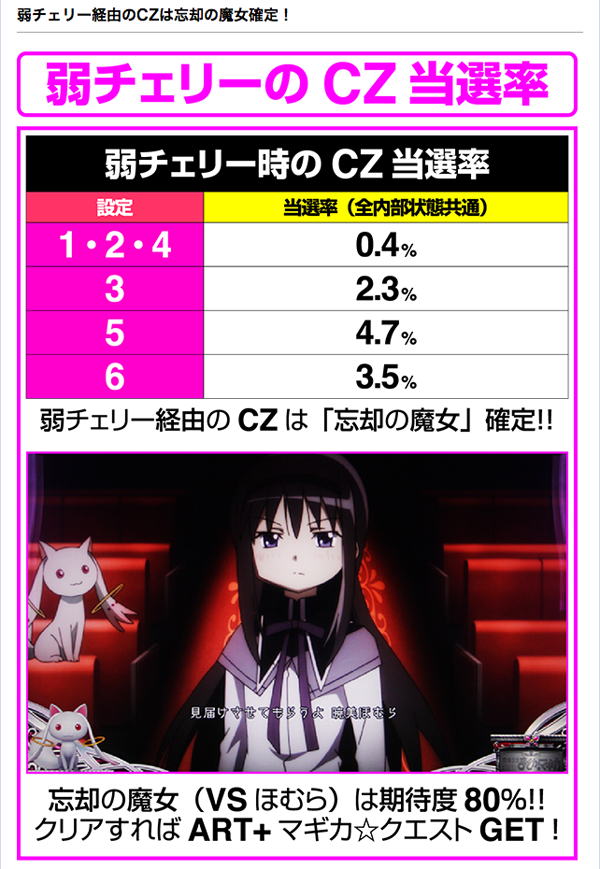 設定5や6でも当選率は低いが、通常時における弱チェリー成立時のCZ当選率にも設定差が存在する。