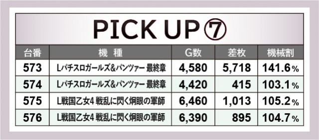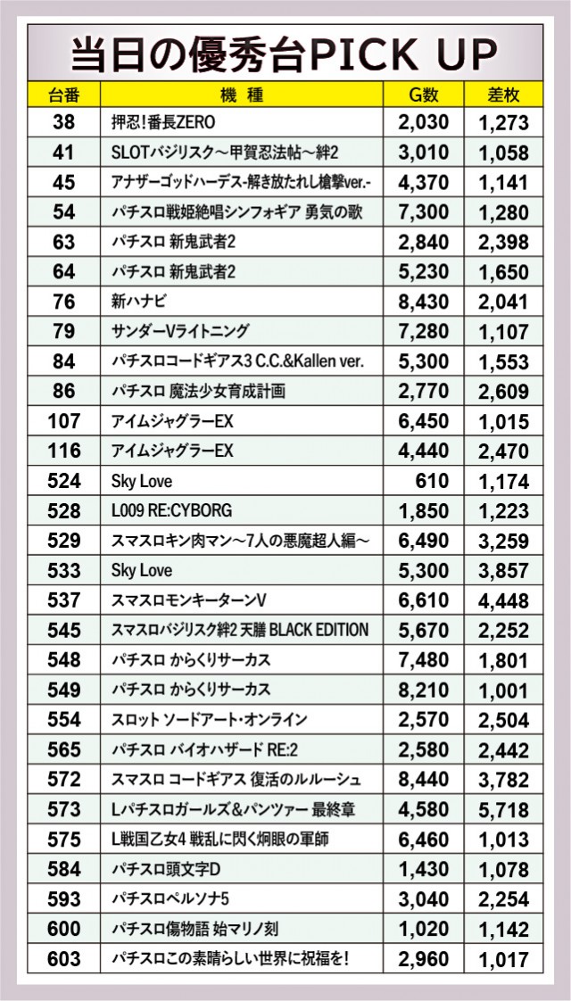 優秀台をチェックすれば分かるように、当日はとても幅広い機種が活躍していたようだ。その中で『Lパチスロガールズ&パンツァー 最終章』573番台+5,718枚という大きな熱量を確認できれば、『スマスロモンキーターンV』537番台+4,448枚といった活躍も見られる。閉店までじっくりと打ち込まれた台もあり、ファンは力強くレバーを叩いては、自信を持って遊技ができたに違いない。