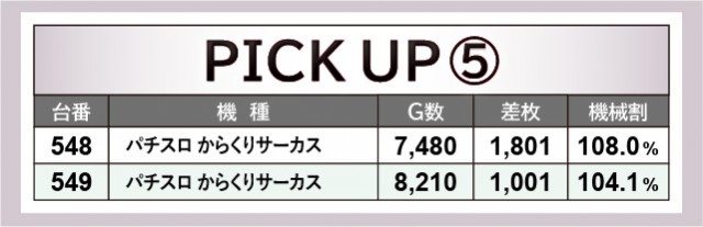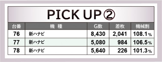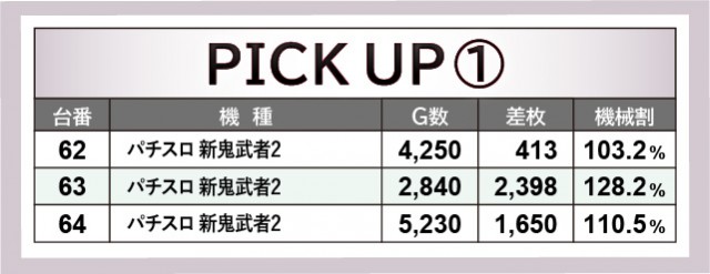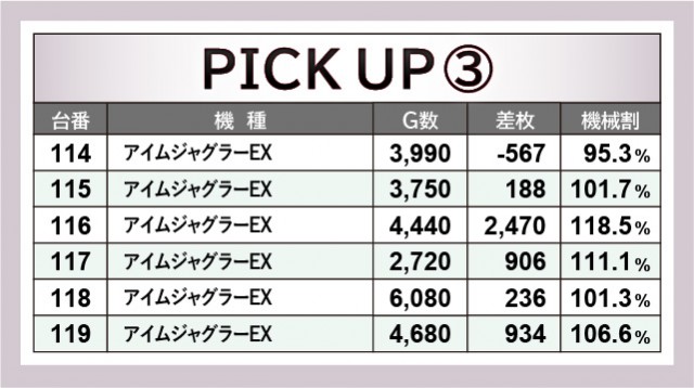 ともに3台設置の『パチスロ 新鬼武者2』『新ハナビ』は全台プラス差枚を達成。両者ともファンによって打ち込まれた形跡もあり、可能性を見出されて遊技されていたのは確かだろう。『アイムジャグラーEX』も大きなマイナスを築くことなく、114~119番台でコンスタントな大当りを確認できた。有意義な時間を過ごせたエリアなのは間違いなく、満足度の高いエリアとなったようだ。