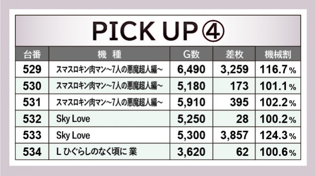 『Lパチスロガールズ&パンツァー 最終章』573番台+5,718枚という活躍が目に焼きつくが、他の注目エリアでも全台プラス差枚を達成しており、活気と熱気に溢れた1日になったようだ。『スマスロキン肉マン~7人の悪魔超人編~』529番台+3,259枚・『Sky Love』533番台+3,857枚という数字も見られるため、こちらも充実の1日になったことだろう。