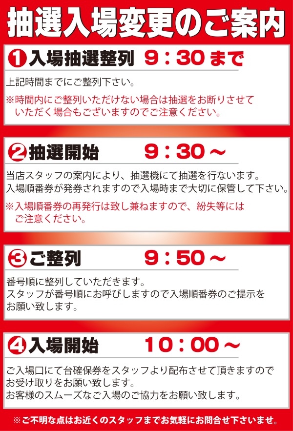 9:40までにお並び頂いた人数での抽選を行ないます。 |