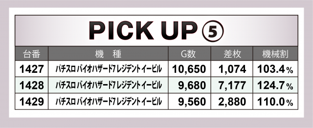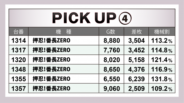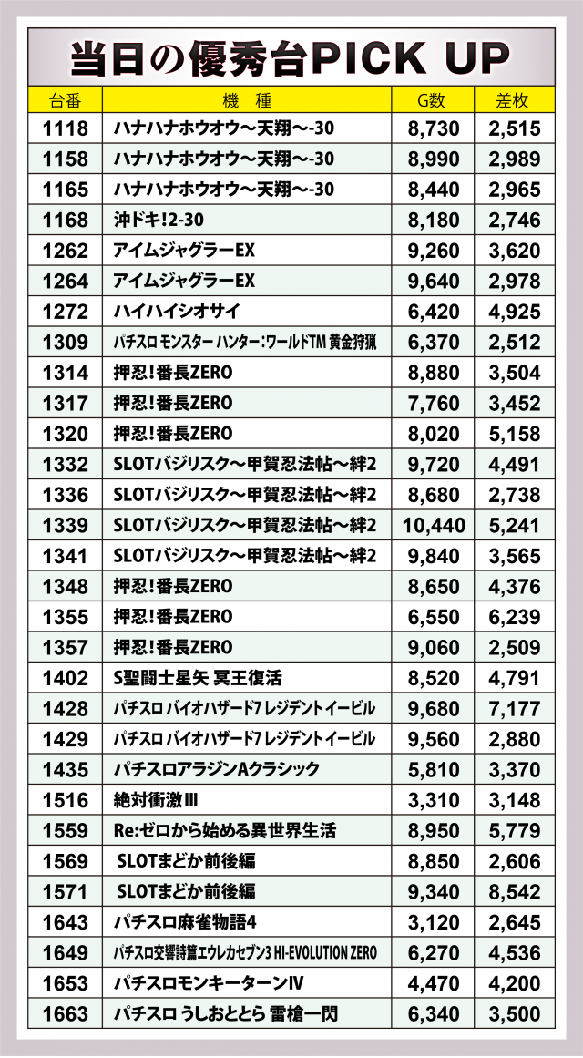 さらにこの日は5機種の好調さが際立った。『押忍!番長ZERO』は6台トータルで+2万5千枚超、『SLOTバジリスク~甲賀忍法帖~絆2』は同じく6台合計で+1万9千枚を突破! その他3機種もそれぞれの合計が+1万枚オーバー!!