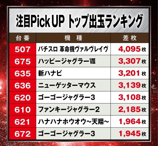 この日、最もプレイヤーの注目を集めていたのが、いまだ人気が衰えない大ヒット機種『パチスロ 革命機ヴァルヴレイヴ』で、507番台が+4,095枚を記録しランキングトップに輝いた。