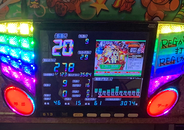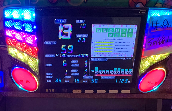 1台のボーナス合算確率は1/123と設定6の数値を上回り、もう1台は1/130を記録していた。