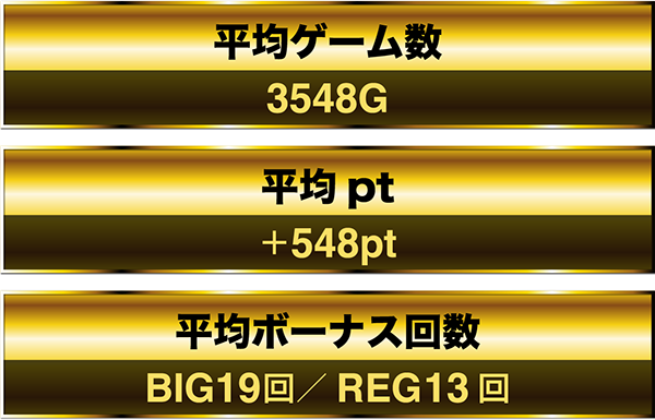 1日を通したデータでは、平均ゲーム数が3548G。平均差枚数はプラス548ptを記録した。