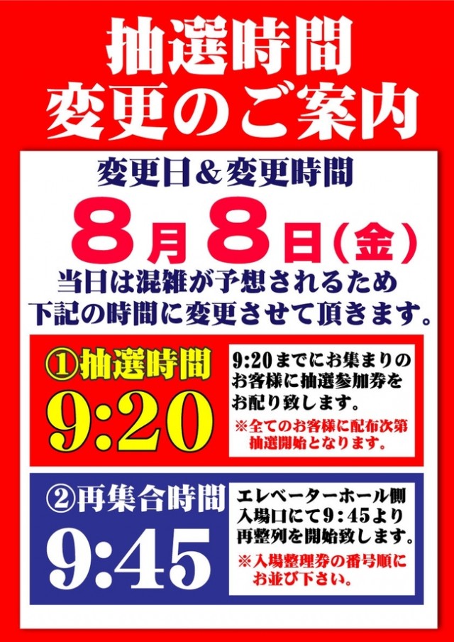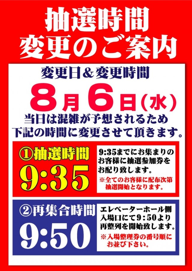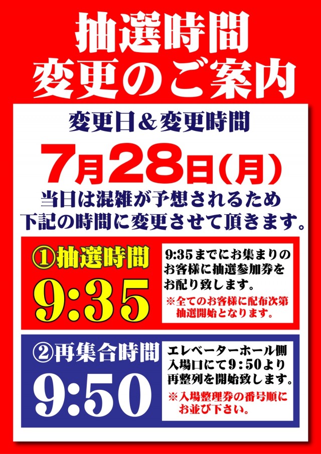 2025/07/257月26日は混雑が予想されますので抽選時間を変更致します‼️