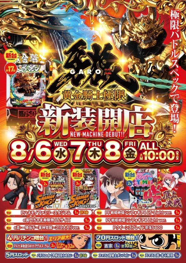 2025/08/05明日8月6日 新装開店‼️ 牙狼17台導入‼️明日 8月6日 ★新装開店★ 牙狼全17台導入!! 1パチにも導入です!     皆様のご来店をスタッフ一同 心よりお待ちしております。